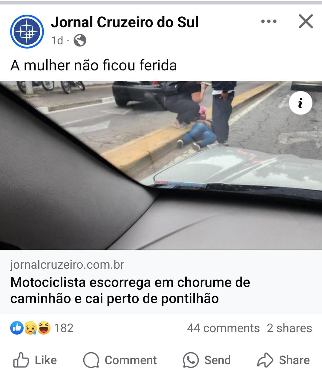 Motociclista escorrega em chorume de caminhão e cai perto de pontilhão